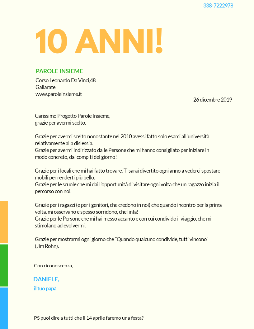 Lettera per un anno insieme. Arthur Rimbaud - Wikipedia Arthur Rimbaud nacque il 20 ottobre 1854 nella cittadina di Charleville, nelle Ardenne, al numero 12 di rue Napoléon (poi rue Bérégovoy).Il padre Frédéric (1814-1878) era un capitano dell'esercito che partecipò alle guerre d'Algeria e di Crimea, e nel 1854 fu decorato con la Legion d'onore. Lettera aperta, riflessioni di fine anno - Roberto Re Lettera aperta, riflessioni di fine anno. Condividi questo articolo! Termina oggi quello che, senza dubbio, è stato per me l'anno più impegnativo della mia vita. Spesso le persone credono che, poiché sono "Roberto Re", la vita mi sorrida sempre e io non abbia mai problemi o momenti di difficoltà, non conosca l'insicurezza, la ... Lettera Al Marito Morto - Buon Compleanno Marito Dediche ... Una lettera spedita al marito, morto due anni fa, per un compleanno che non è stato possibile festeggiare insieme. "vorrei che tu fossi qui ancora per un giorno, ancora per un anno", la lettera d'amore per il marito scomparso nascosta nel palloncino. Un anno di noi - Bar Giomba Auguriamoci che ce ne siano ancora, ancora, ancora, per il resto della vita che verrà! Restiamo insieme per sempre, continuiamo a camminare, mano nella mano, come abbiamo fatto lungo tutto quest'anno: viviamo insieme le nostre vite, cresciamo, continuiamo a sorprenderci e ad imparare, ma facciamolo insieme…