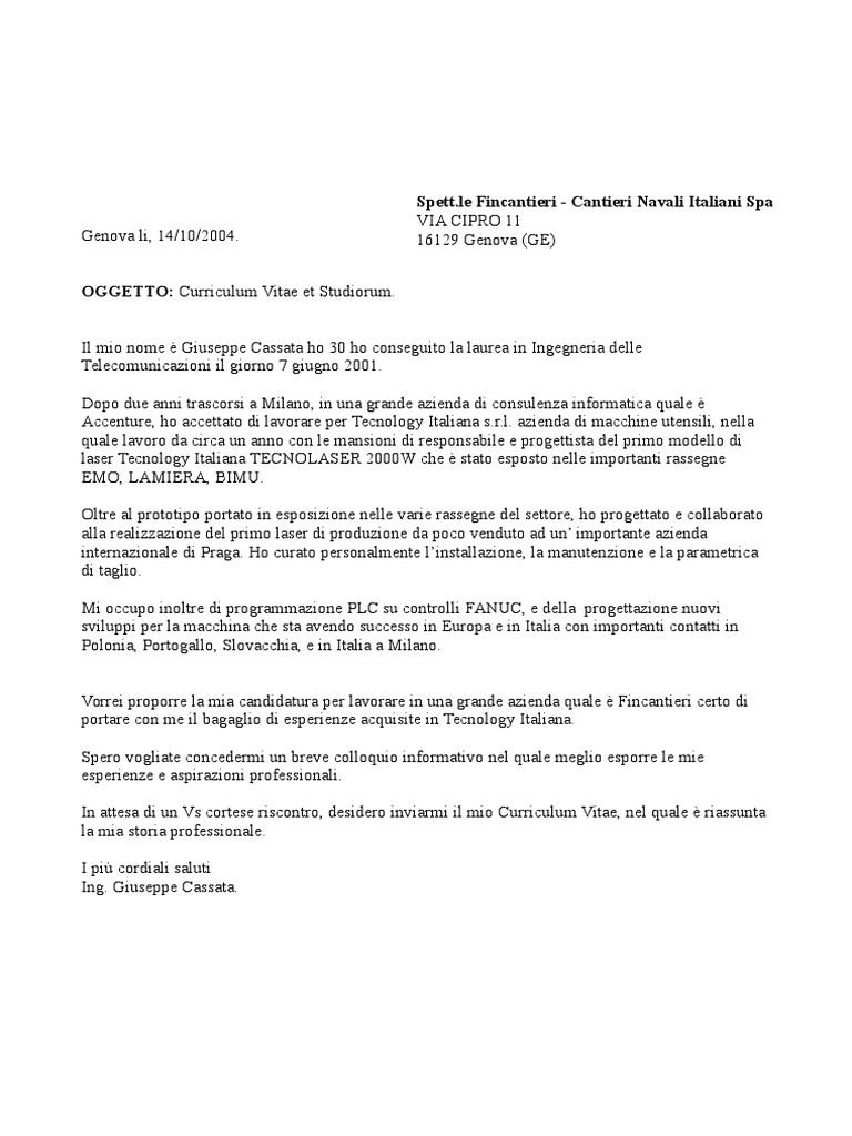 Lettera di presentazione (candidatura spontanea) Oggetto: Candidatura per l'area commerciale Egregio Signor Canterlo, vorrei sottoporre alla Vostra cortese attenzione il mio interesse ad un eventuale assunzione nella Vostra azienda, leader nel settore dell'abbigliamento. Ho un particolare interesse per l'area commerciale, nella quale ho già maturato una prima conoscenza professionale.