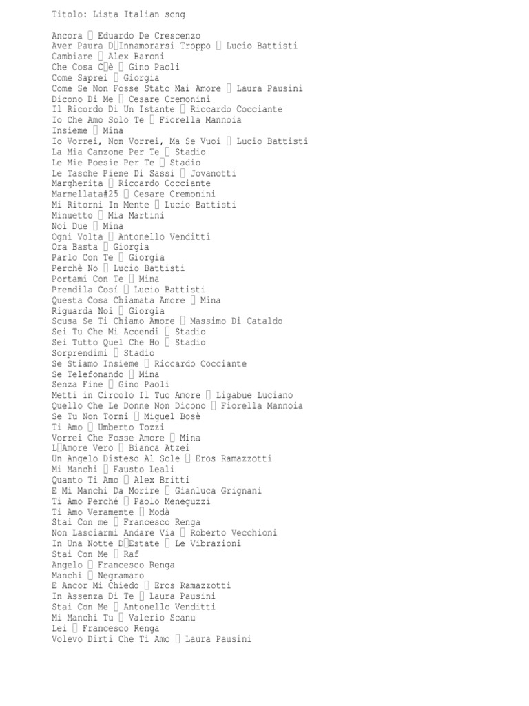 Titoli canzoni con la lettera a. Lista Cantanti Italiani Famosi dalla A alla Z - Canzoni.it See full list on canzoni.it Hit Parade Italia - Indice Per Titolo Quindi se stai cercando "La canzone del sole" devi cercare sotto la C e non sotto la L. Inoltre, i titoli delle canzoni che iniziano con un numero sono stati a volte riportati sotto la sezione "0-9" (come "29 Settembre") e a volte sotto la corrispondente lettera del numero (tipo "Quattro vestiti"): ti consigliamo di provare entrambe le entrate. Elenco canzoni con titolo che inizia con lettere A e B Feb 15, 2023 · Elenco alfabetico canzoni presenti su midi-miti-mici.it A-B C-D E-F-G-H-I J-K-L M-N O-P-Q-R da S a Z Canzoni con titolo che inizia dalle lettere A e B ESTERE MELODICHE ITALIANE POPOLARI FOLK CARTONI BAMBINI NAPOLETANE Elenco alfabetico canzoni presenti su midi-miti-mici.it A-B C-D E-F-G-H-I J-K-L M-N O-P-Q-R da S a Z