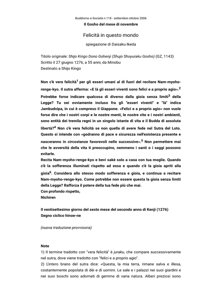 Buddismo e Società n.168 - gennaio... - NAM MYOHO RENGE KYO - Facebook Persino Shijo Kingo, che [al tempo della persecuzione di Tatsunokuchi] era stato disposto a dare la sua vita per ciò in cui credeva, sentì vacillare la sua convinzione nelle parole del sutra «godranno di pace e sicurezza nell'esistenza presente e nasceranno in circostanze favorevoli nelle successive» quando si trovò di fronte a una grave …